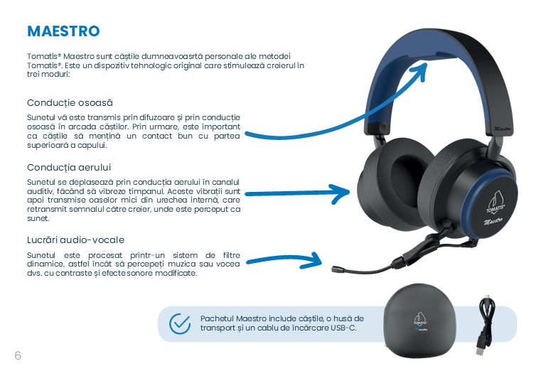 Căștile Tomatis® Maestro sunt concepute special pentru aplicarea profesională a Metodei Tomatis®, un program avansat de stimulare auditivă și neurosenzorială. Acestea îmbină tehnologia de vârf cu o ergonomie optimă pentru a asigura o redare fidelă a filtrărilor și modulațiilor sonore utilizate în antrenamentul auditiv.