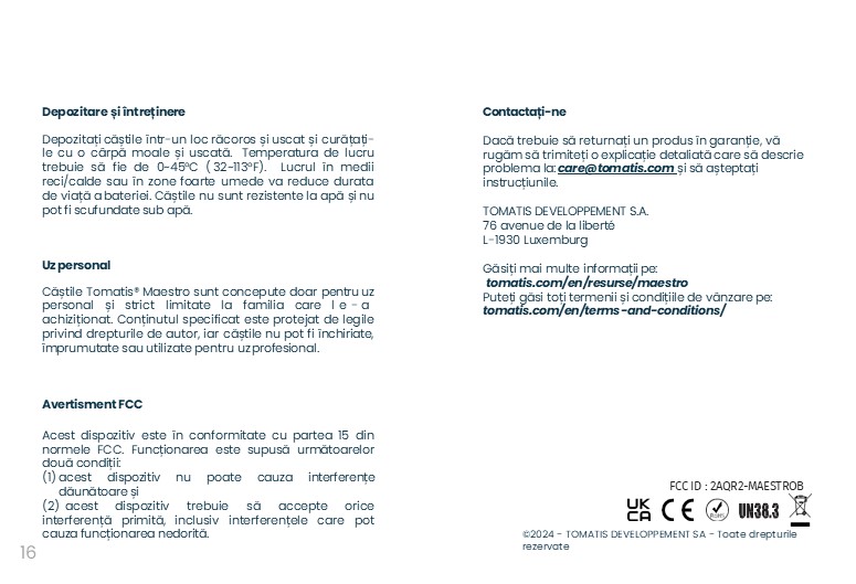 Echipamentul beneficiază de o garanție de 24 luni, acordată de către producătorul Tomatis Developpment S.A., cu sediul în Luxemburg 76 Av. De la Liberté, 1930 Gare. Garanția acoperă defectele de fabricație, defecțiunile tehnice apărute în condiții normale de utilizare, precum și eventualele neconformități ale produsului.